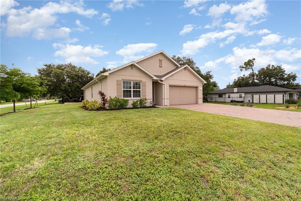 Welcome to this "almost new" beautifully designed, meticulously maintained home, situated on a spacious corner lot in Alva, with no hurricane damage and no flood zone worries. This residence is enhanced by lush, irrigated landscaping, a widened paver driveway, and an extended open paver patio. Designed with convenience and security in mind, the exterior features a whole-house reverse osmosis water treatment system, keyless entry on both garage and front doors, LED corner lighting, a Christmas-ready outdoor outlet, an extended lanai, a Ring doorbell, and a comprehensive security system with three exterior cameras. The home is smoke- and animal-free, ensuring a pristine environment. Step inside to an inviting foyer with tile flooring that flows throughout the home, excluding the carpeted bedrooms. The open-concept floor plan showcases a chef